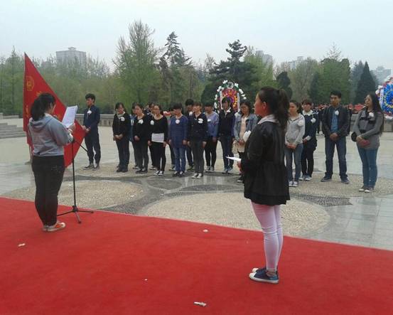 全体师生统一着装,胸前佩戴着同学们亲手制作的小白花,排着整齐的队伍进入陵园内。首先,全体师生向烈士纪念碑敬献花篮、花圈,怀着对着先烈们敬仰的心情,肃穆伫立默哀三分钟,向烈士们三鞠躬,并庄严的宣誓。接着,由学生代表杨华在纪念碑前颂读献文,表达对革命先烈们的崇高敬意。最后,同学们列队瞻仰烈士墓、参观济南战役纪念馆。在讲解员的讲解下,同学们都深深地被革命先烈的英雄气概感动,无不肃然起敬。