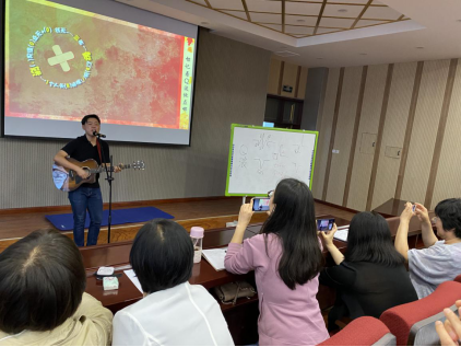 讲座中,范博渊老师围绕“寓教于享,寓教于乐---谈以文学为主导多种艺术形式融入的教学设计”主题,为医学院教师带来一场视听盛宴。他精心准备此次讲座,毫不保留把自己如何设计教案,如何进行课件制作的技巧全盘托出。他还现场展示了自己荣获国奖的比赛内容,20分钟的讲课中穿插角色扮演、吉他弹唱等形式。时间把控完美,课件制作新颖、内容丰富,层次感强。他认为一个好的老师,要热爱教师工作,要以学生为中心,让学生觉得上课是快乐的,双方都要享受其中,教师必须涉猎广泛,课堂设计要有创新,借助互联网优质资源做好课件,用讲故事的艺术形式将枯燥的医学知识变得立体形象,还要将立德树人的理念,思政的内容贯穿到课堂中,做到“润物细无声”。范老师精彩的讲解博得与会教师的热烈掌声。